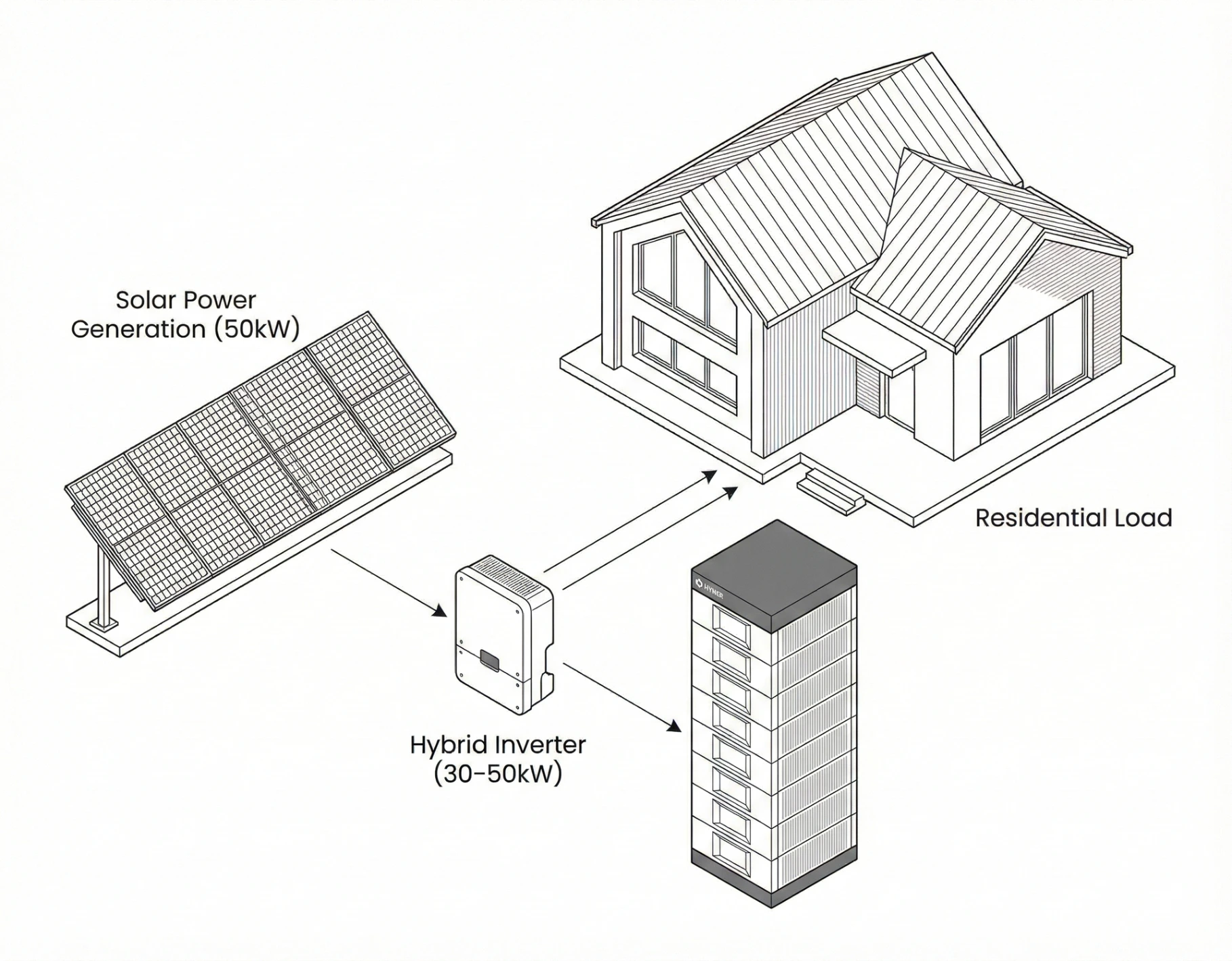 - Compatible with 30–50 kW hybrid inverters and 50 kW solar arrays